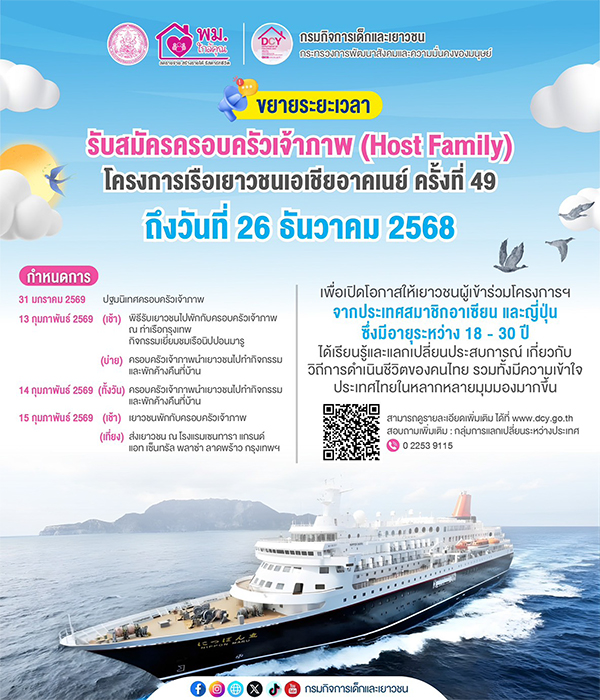 ขยายเวลา...รับสมัครครอบครัวเจ้าภาพ (Host Family) โครงการเรือเยาวชนอาคเนย์ ครั้งที่ ๔๙ ถึงวันที่ ๒๖ ธันวาคม ๒๕๖๘
