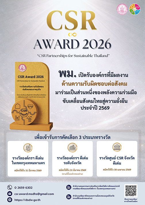 พม. เปิดรับองค์กรที่มีผลงานด้านความรับผิดชอบต่อสังคมมาร่วมเป็นส่วนหนึ่งของพลังความร่วมมือขับเคลื่อนสังคมไทยสู่ความยั่งยืน ประจำปี 2569 ( CSR Award 2026 )